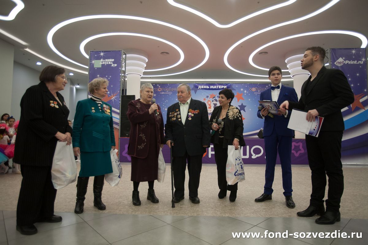 Также на этот замечательный вечер, посвящённый Дню Матери в России, были приглашены гости из Московского комитета ветеранов войны: Алексеева Вера Александровна – председатель комиссии по работе с женщинами–участницами войны МКВВ, почётный ветеран г. Москвы и ветеран труда, награждена медалями; Коробова Антонина Павловна – участниц ВОВ, имеет орден и медаль; Горюнова Любовь Акимовна – ветеран военной службы и труда, медсестра; семья Калининых Юрия Алексеевич (участник ВОВ, награждён орденами, художник) и Зинаида Александровна (ветеран труда) в 2017 году отметившие 60-летний юбилей супружеской жизни. Почётным гостям были вручены подарки от спонсоров БФ «Созвездие детских талантов».
