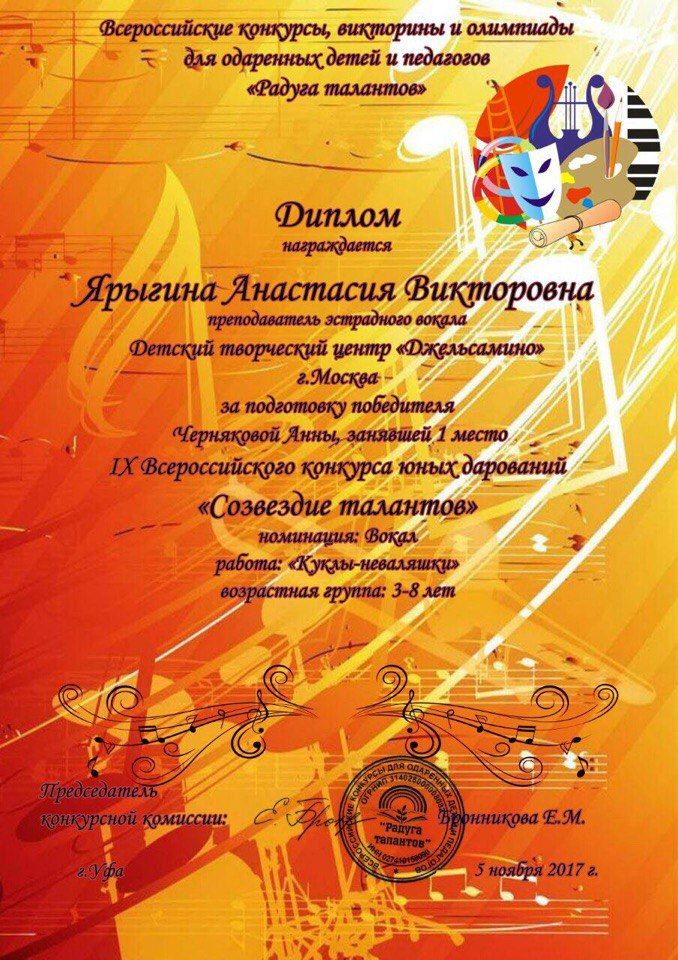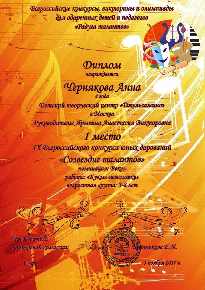 Поздравляем Анечку Чернякову и педагога Анастасию Ярыгину с 1-м местом на IX Всероссийском конкурсе юных дарований «Созвездие талантов» в номинации вокал 3-8 лет (работа «Куклы-неваляшки»)!